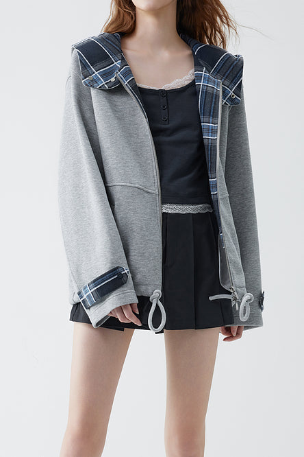Hooded sweatshirt,neckline with openable snap buttons,hood and placket with plaid patchwork design,two sleeves with decorative plaid cuff tabs,hem with drawstring for adjusting tightness |