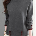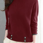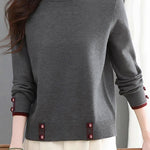 Pullover knitted top,color-block design,crew neck long-sleeve loose fit,decorative buttons on neckline,hem and cuffs |