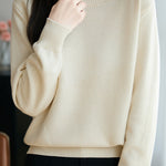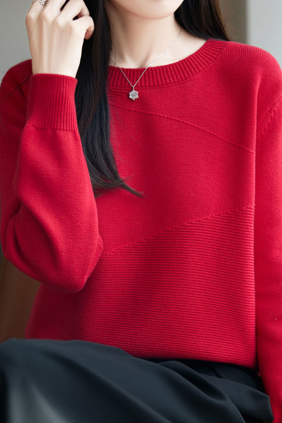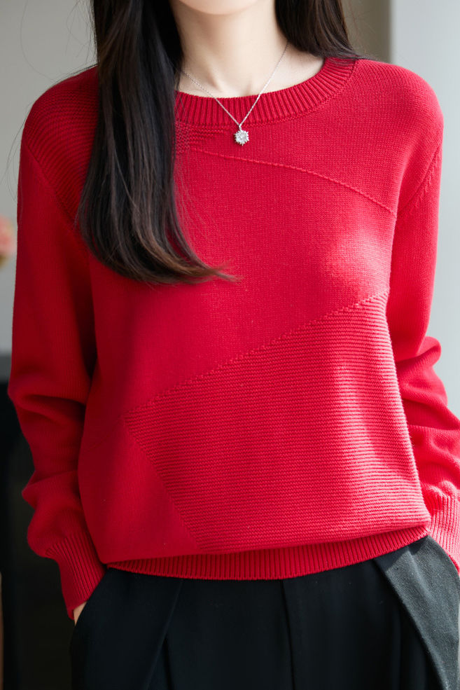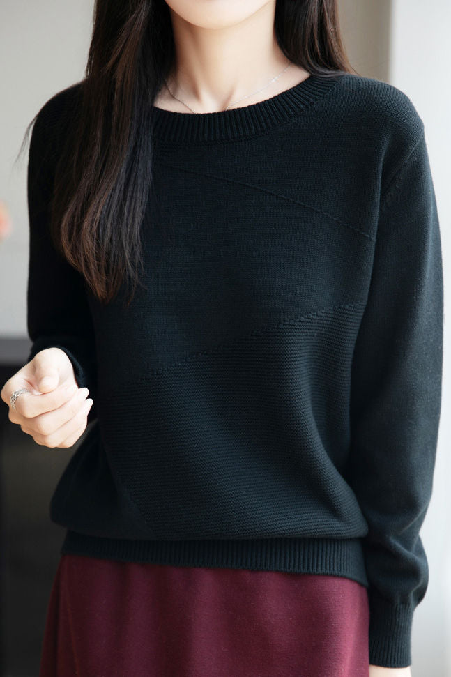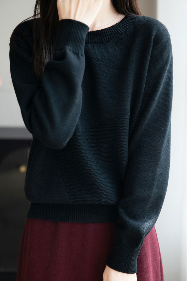Pullover knitted top,solid color,crew neck long-sleeve fit,front panel with striped jacquard texture design |