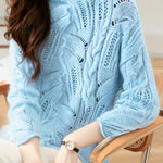 Knitted top,solid color hollow-out design,half-high neck long-sleeve pullover loose fit |