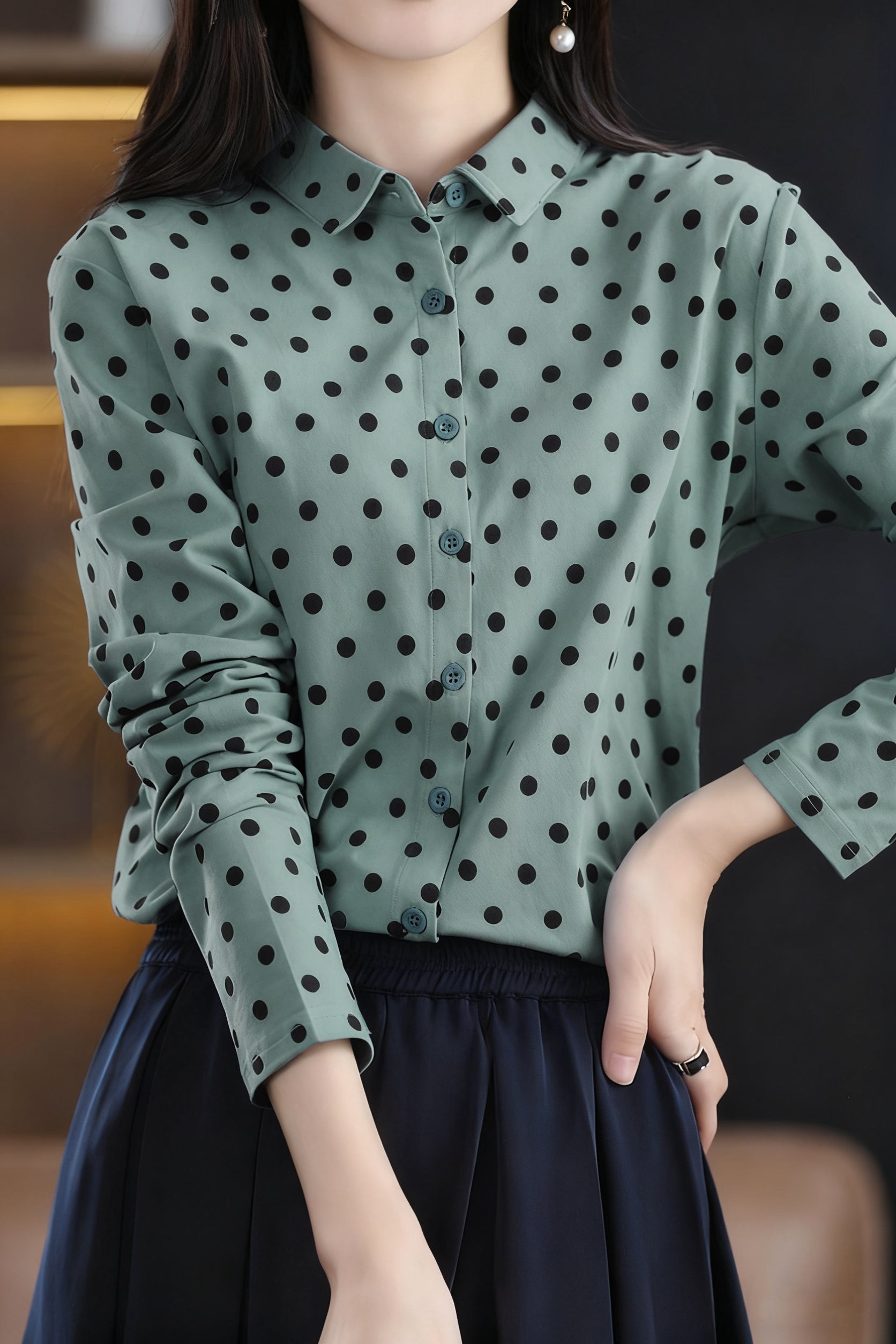 Shirt,shirt collar long-sleeve loose fit,polka dot pattern,front placket with unbuttonable buttons |