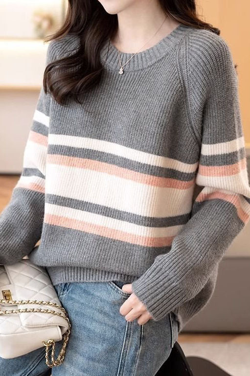 Pullover sweater,crew neck long-sleeve loose fit,color-block stripe design |