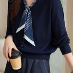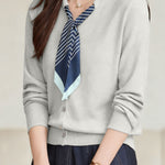 Cardigan,crew neck long-sleeve loose fit,front center with openable buttons,neckline with scarf tie for adjusting tightness,scarf with blue and white color-block striped design |