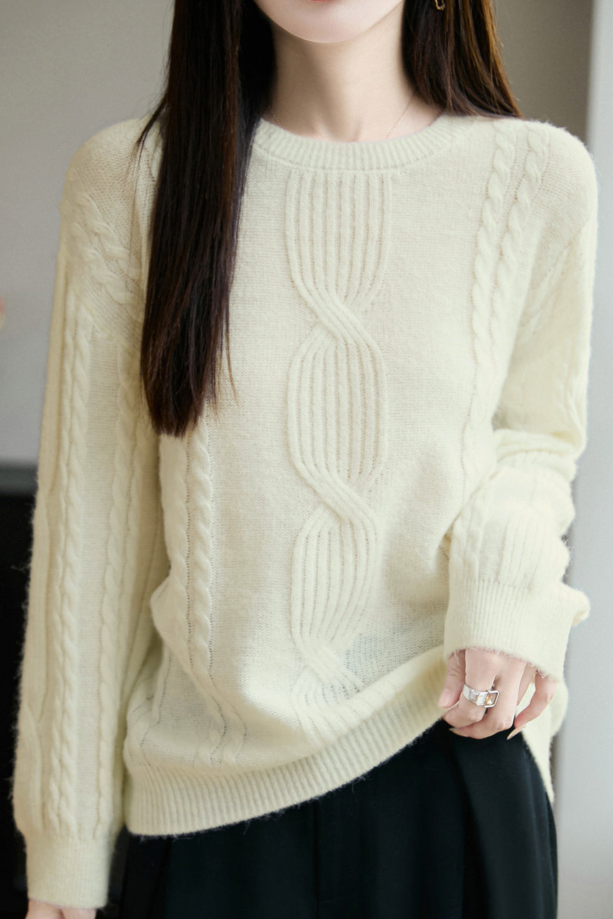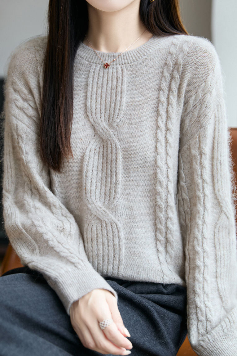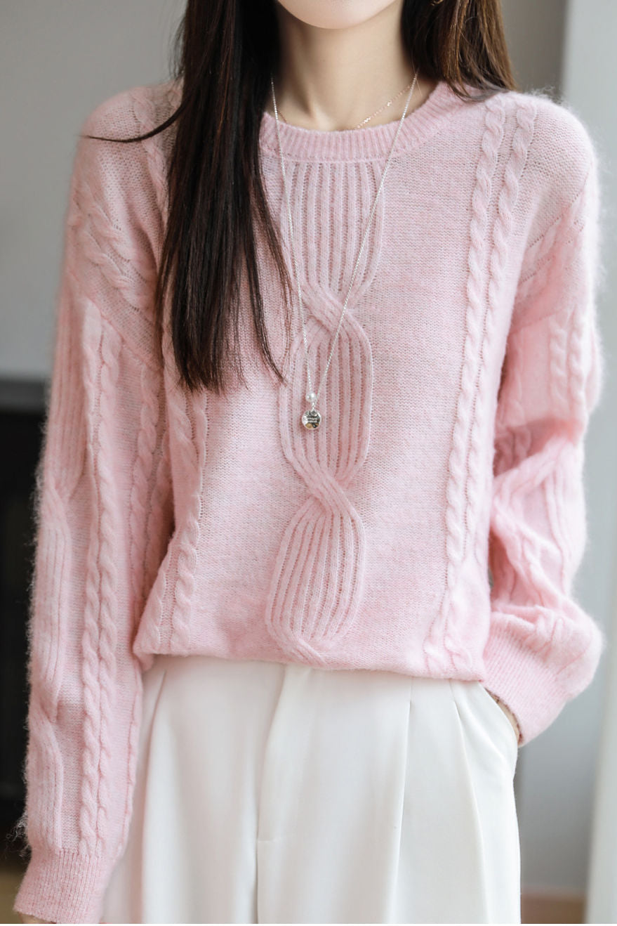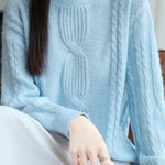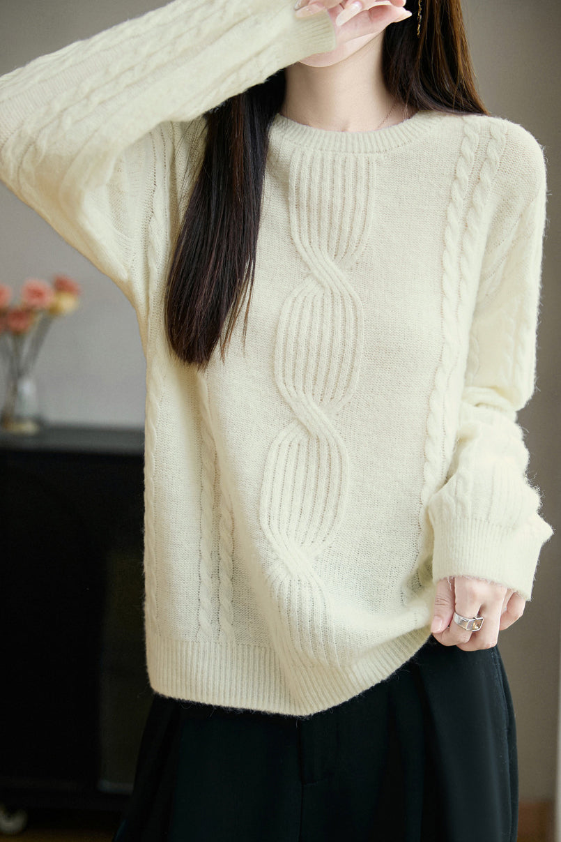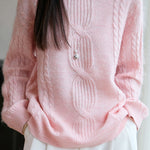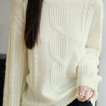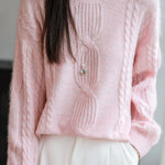 Casual Versatile Solid-Color Crew Neck Pullover Cable-Knit Sweater