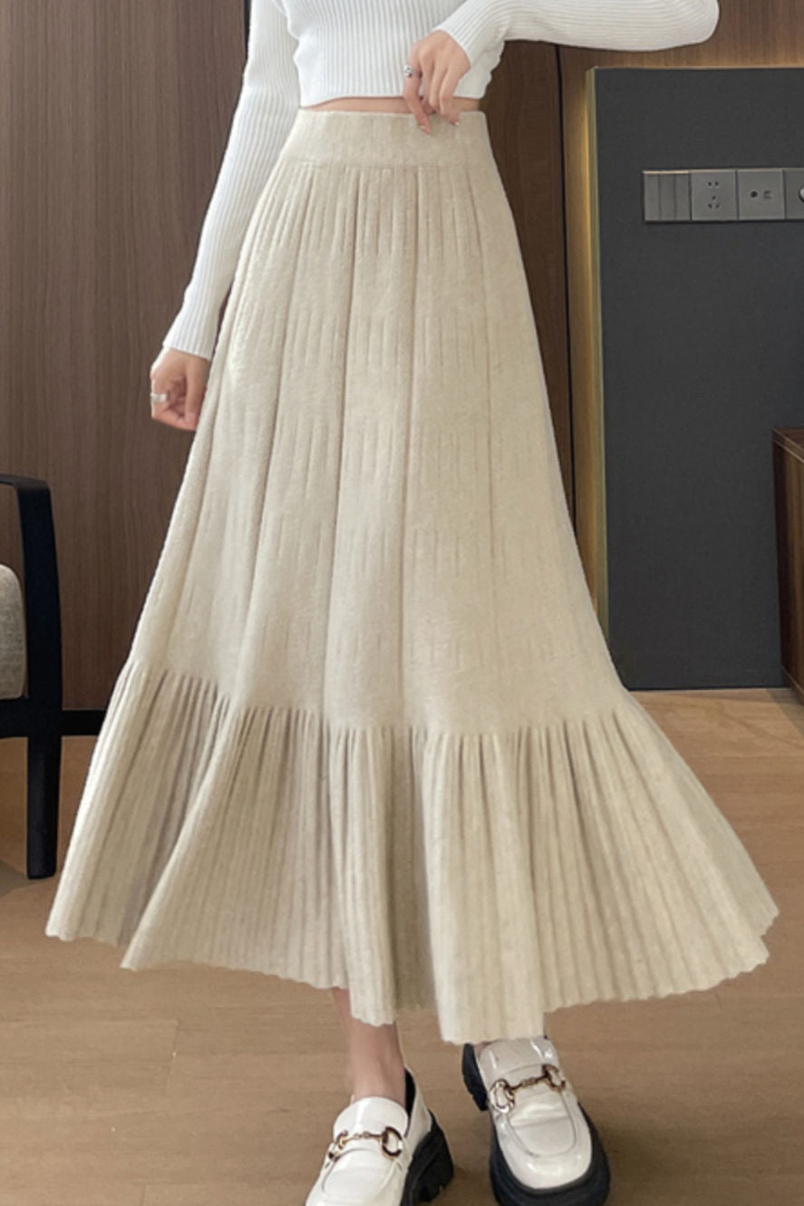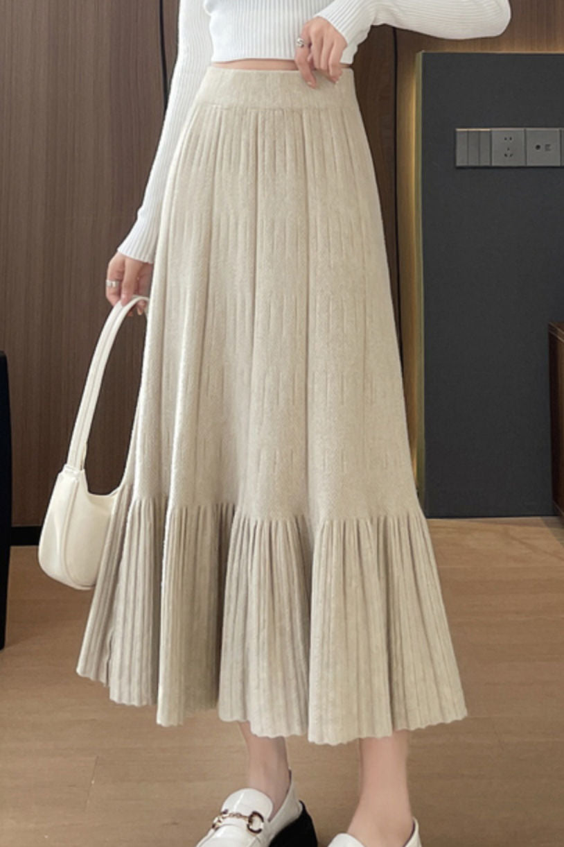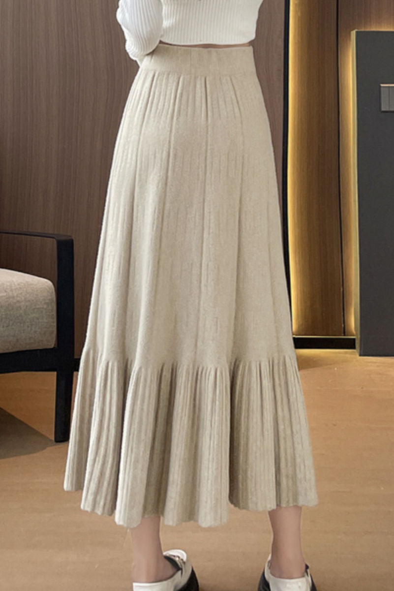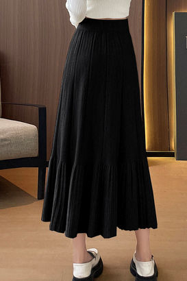 Knitted midi skirt,high-waist a-line loose fit,solid color mid-length,lower half of skirt with pleated design |