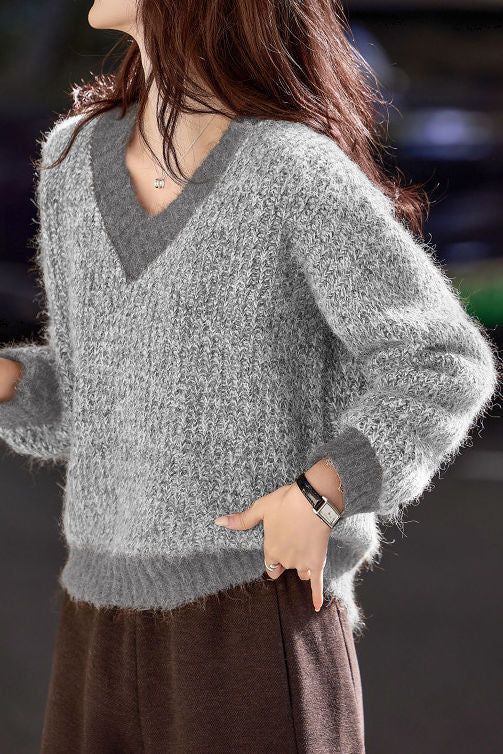 Sweater, v-neck design, neckline and cuffs with color-block paneling, fluffy and soft knitted texture, loose and comfortable fit, simple and elegant details |