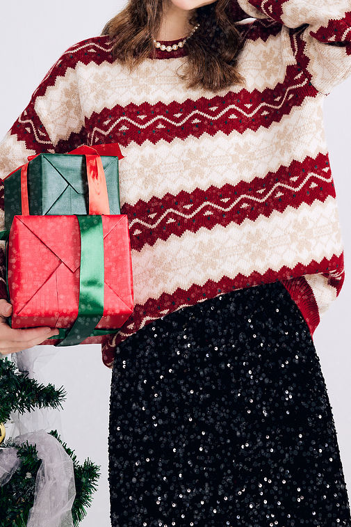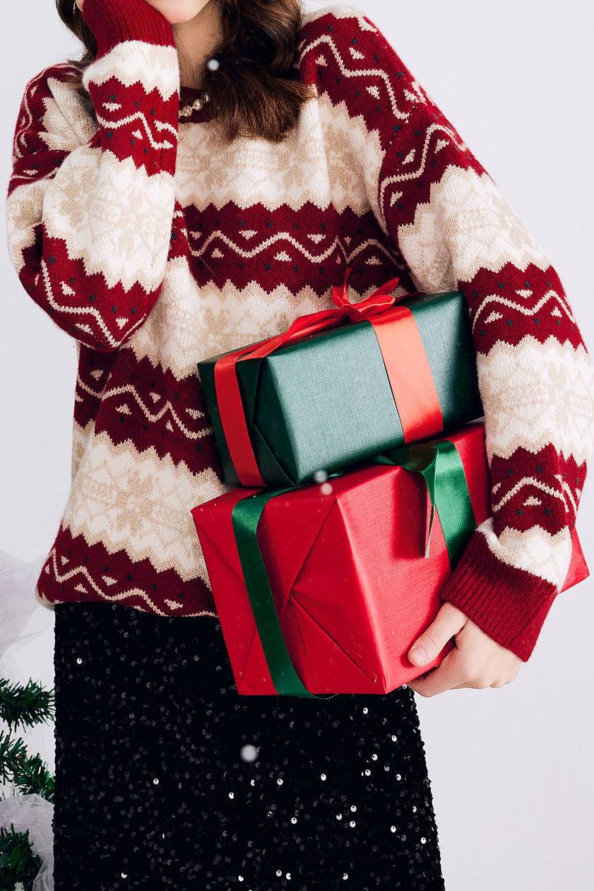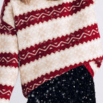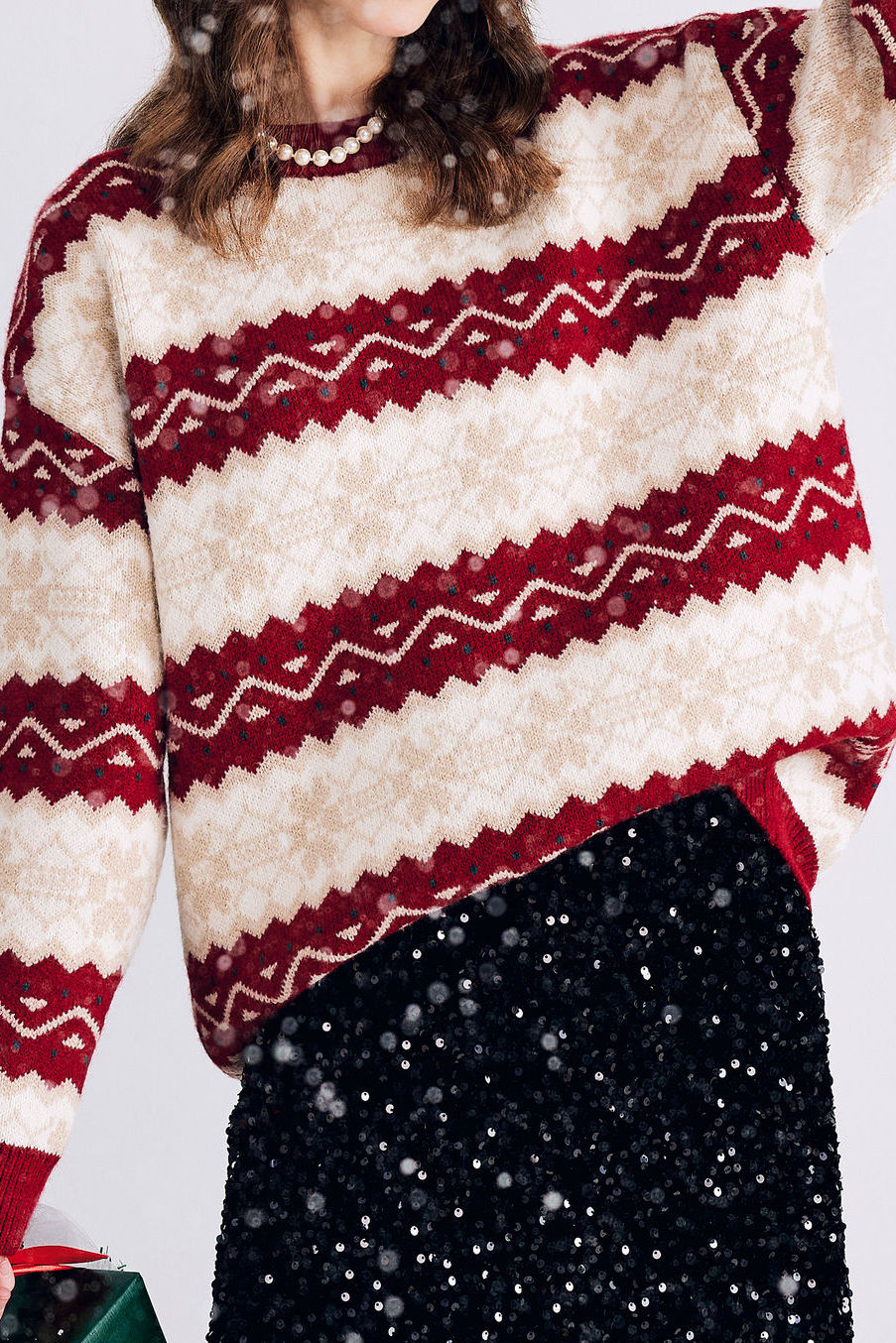 Sweater, crew neck design, body with striped texture and geometric pattern decorations, soft and fluffy knitted fabric, loose and casual fit |