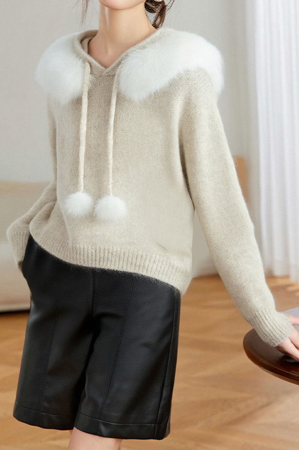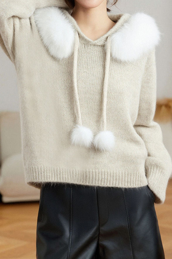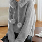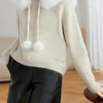 Knitted top, hooded design, with detachable decorative collar for versatility, drawstring with pom-pom details for fun, fluffy and skin-friendly knitted fabric |