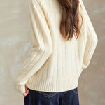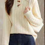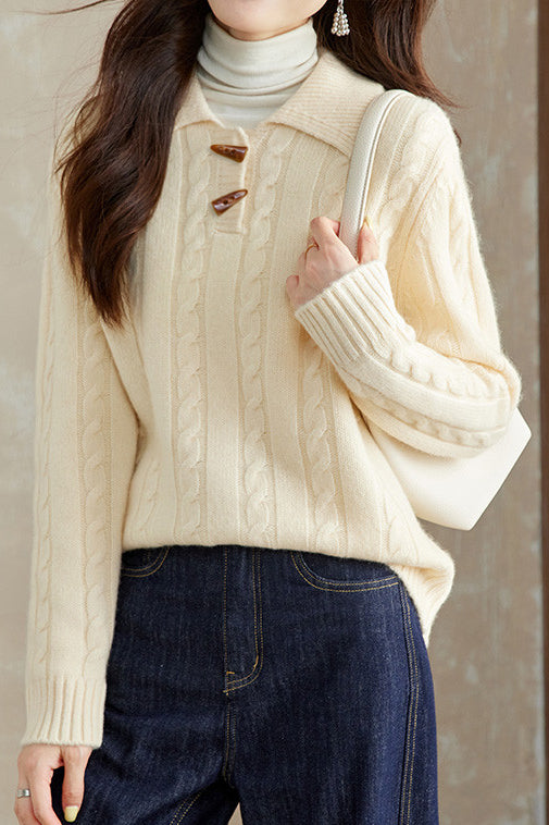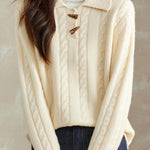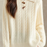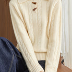 Casual Versatile Solid-Color Cable-Knit Ivory Lapel Knitted Top