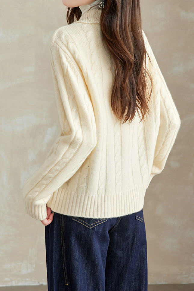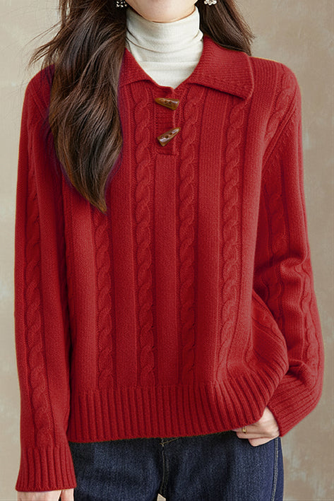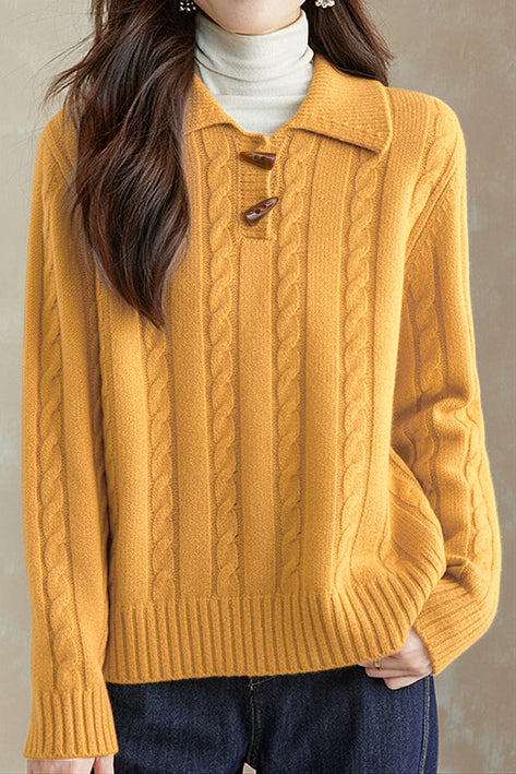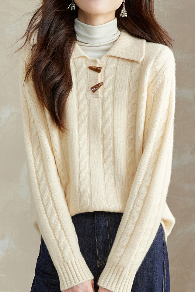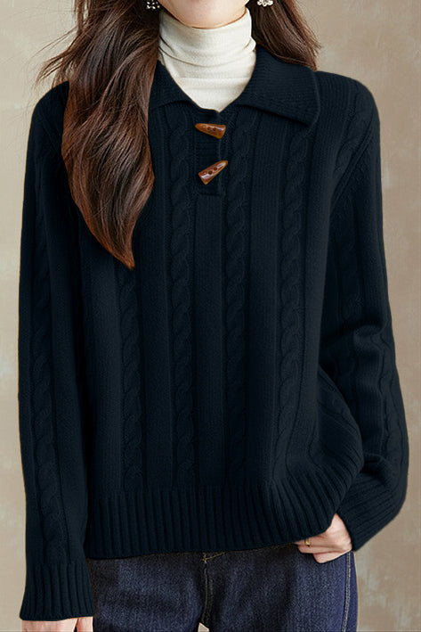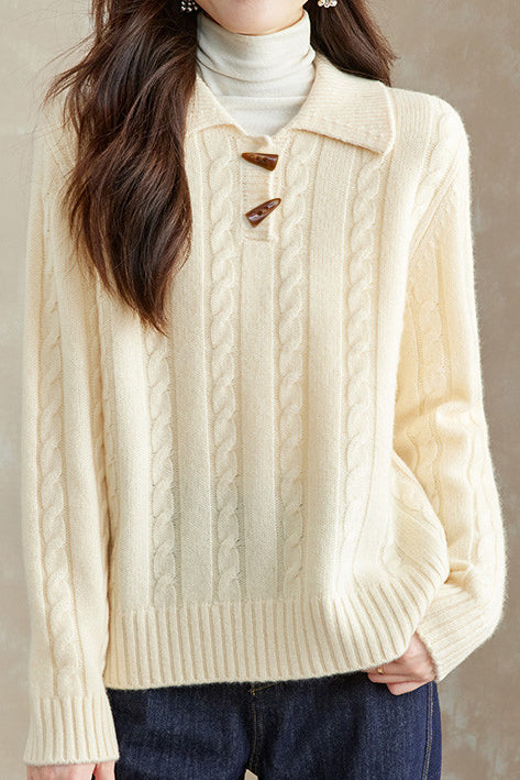 Knitted top, lapel long-sleeve loose pullover fit, neckline with openable ivory-shaped buttons, full-body vertical cable-knit and wide ribbed design |