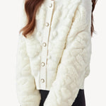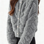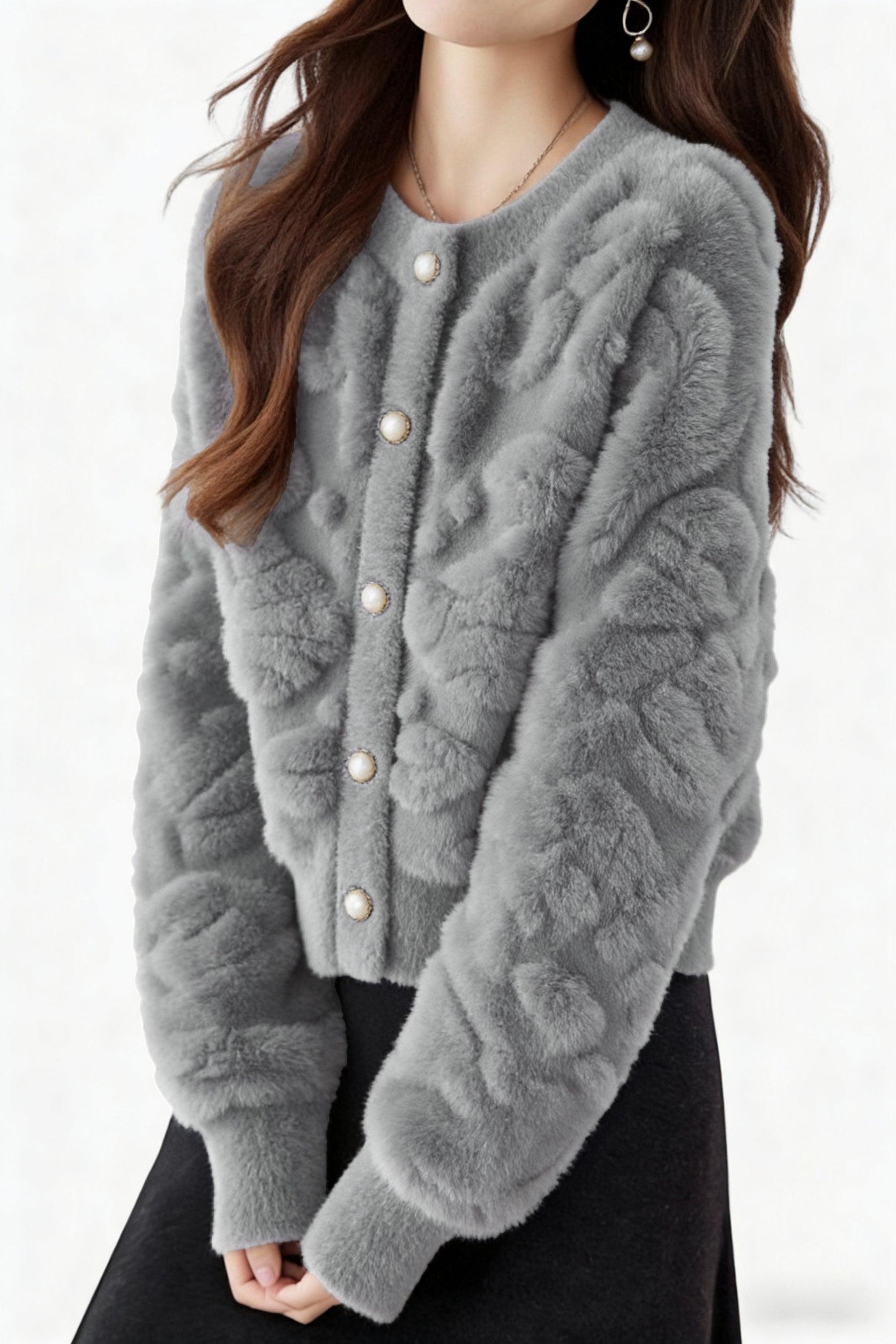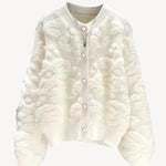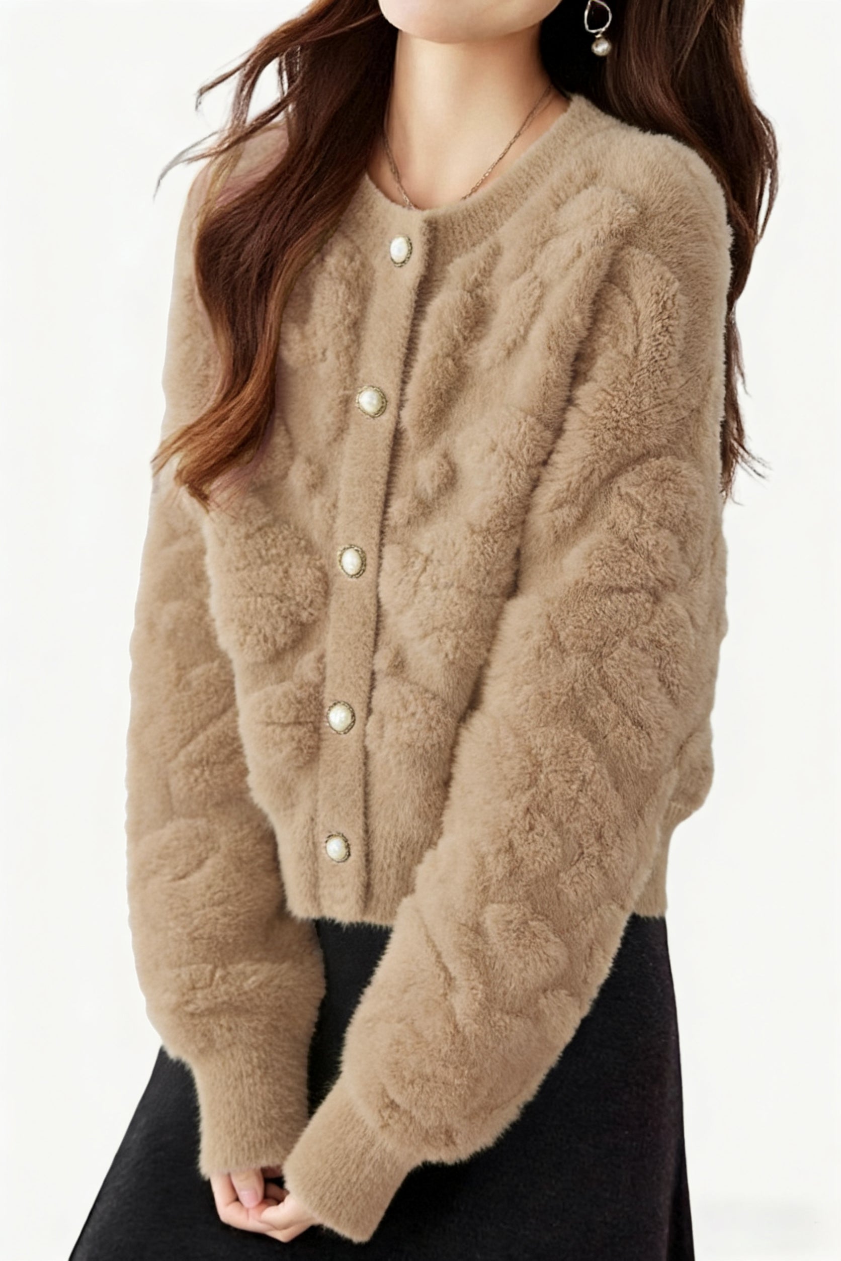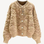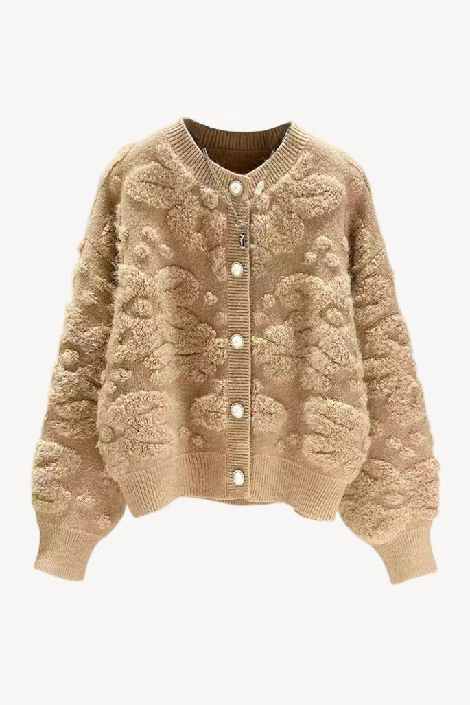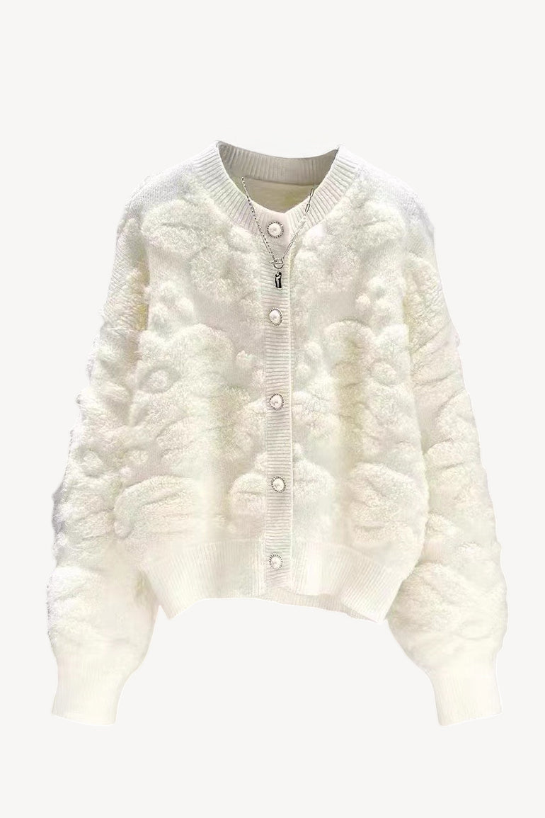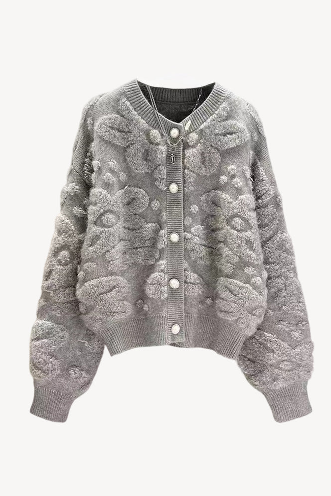 Knitted cardigan, crew neck long-sleeve loose fit, front placket with openable pearl buttons, body decorated with floral textured patterns |