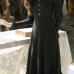Dress, v-neck long-sleeve pullover fit, a-line skirt silhouette, neckline, cuffs and hem with sheer gathered lace trim, front center with non-openable decorative pearl buttons |