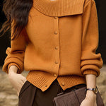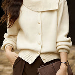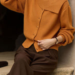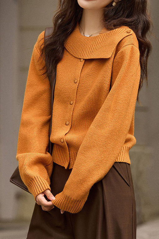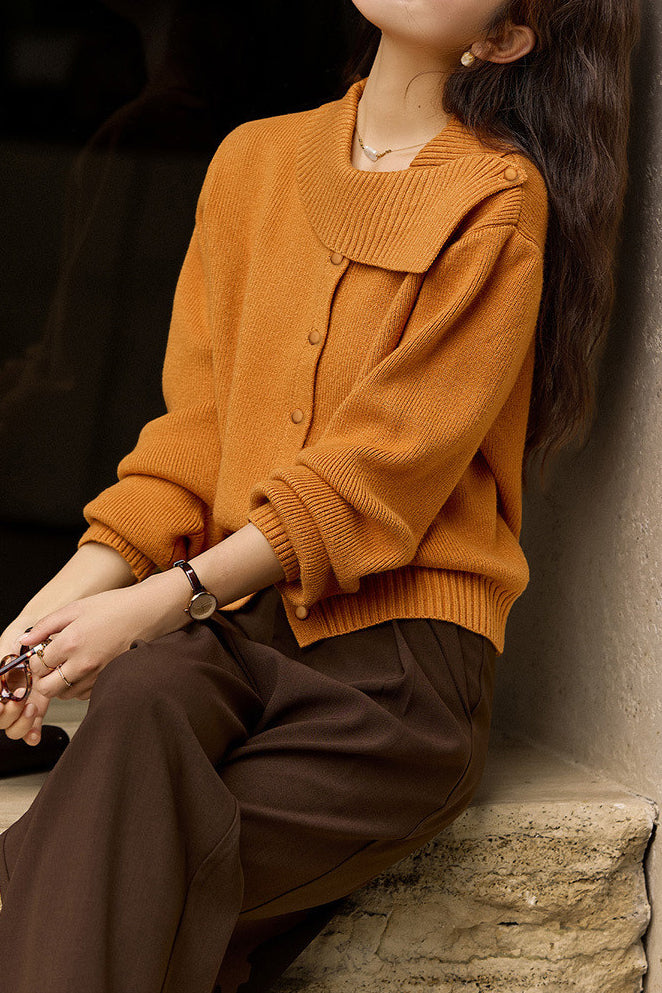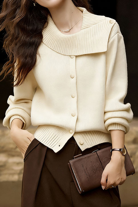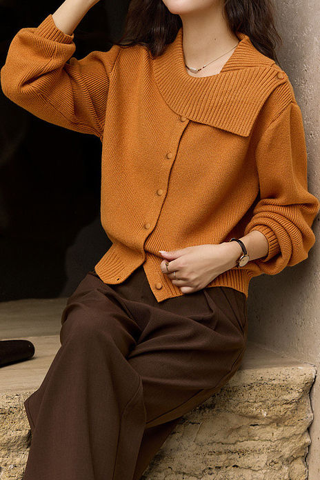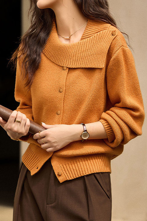 Cardigan, irregular collar design, shoulders decorated with buttons for extra details, single-breasted button closure for simplicity, soft and warm knitted fabric |