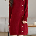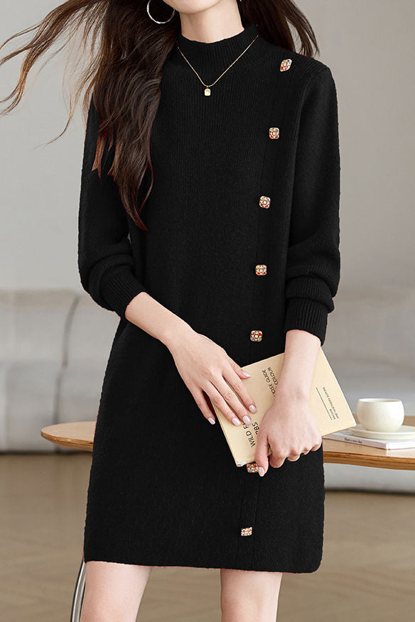 Knitted dress, half-high neck long-sleeve loose fit, body with metal decorative buttons, fabric infused with silver lurex for added interest |