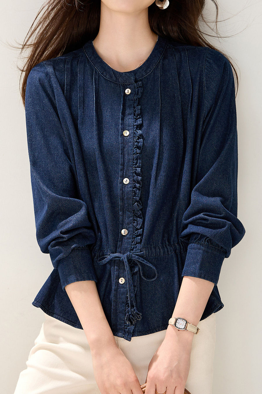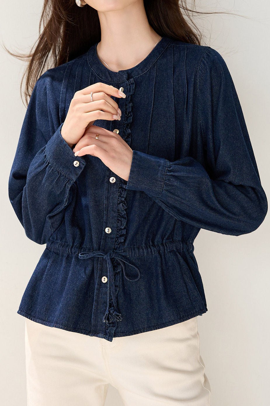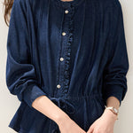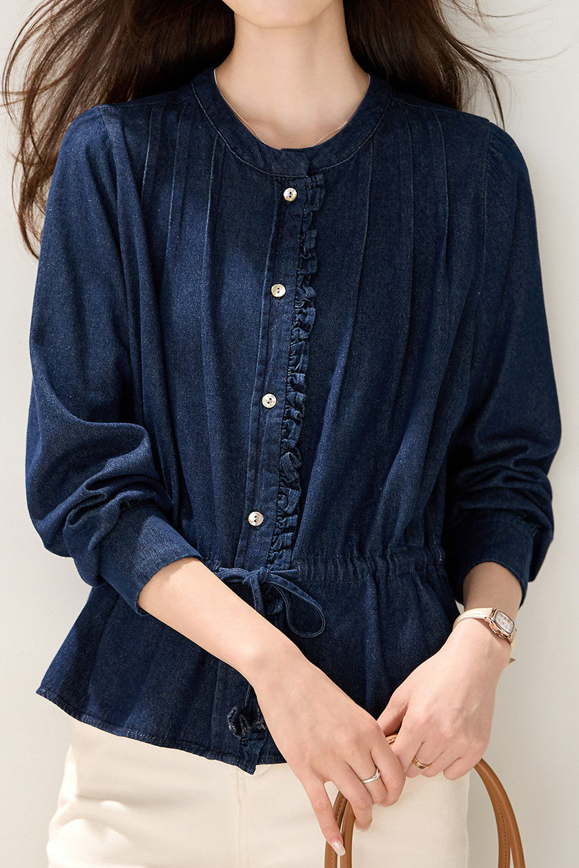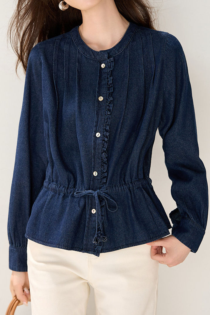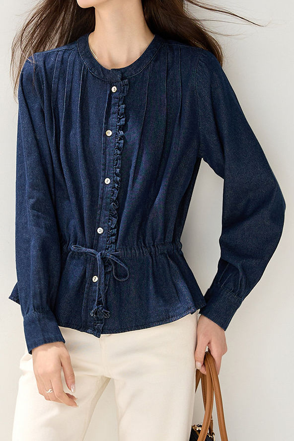 Denim Shirt, crew neck long-sleeve elasticated waist fit, full-body vertical pleated texture, openable color-block buttons on front placket, ruffled trim decoration on placket edges, drawstring waist for adjustable fit, overall loose silhouette with adjustable tightness |